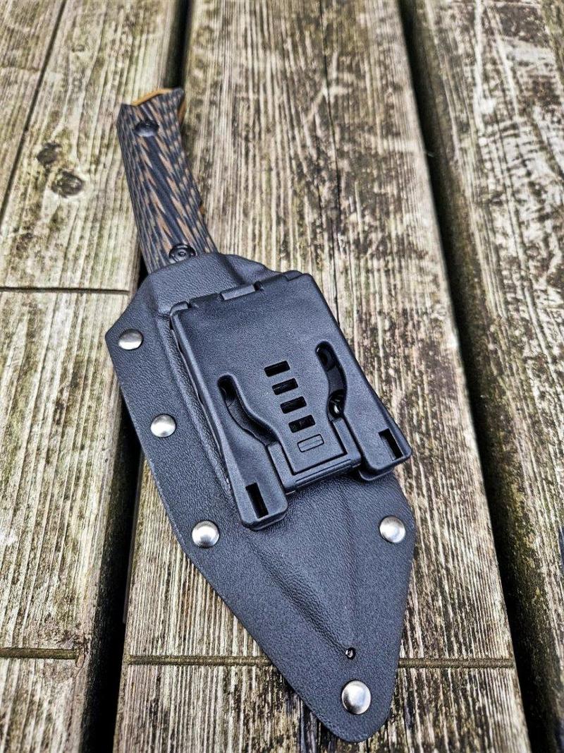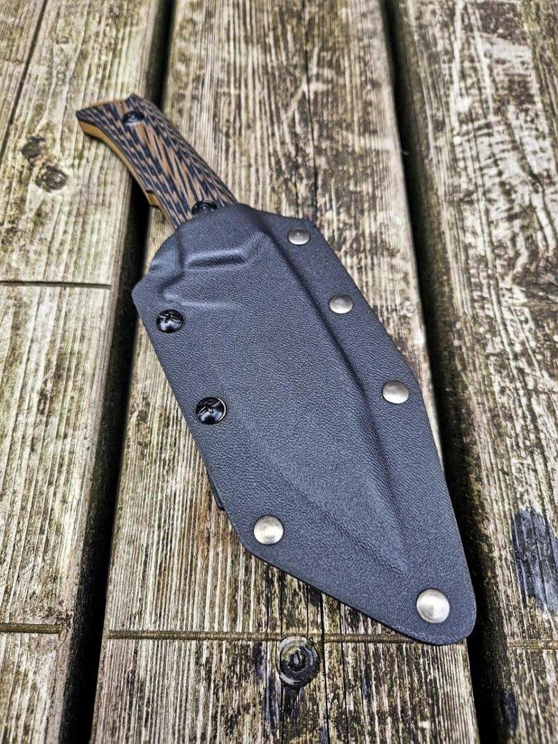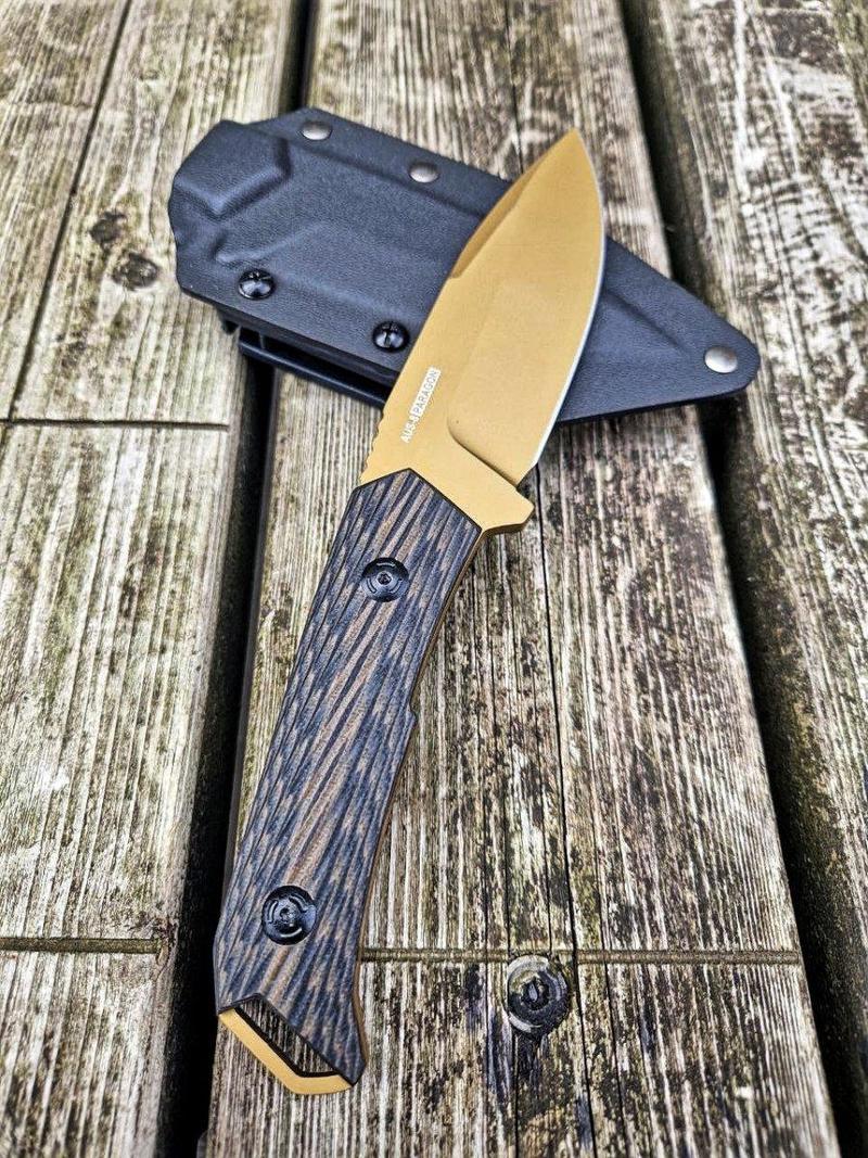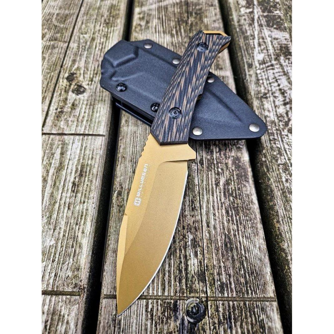 The Willumsen Paragon is a powerfully built fixed blade with many outstanding features. The blade is made from AUS8 stainless steel with an attractive and functional tan Titanium coating. It has a full, exposed tang giving the design enormous strength. The handle scales are a desert and tan G10 mix.