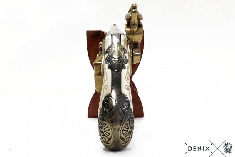 Replica av en toløpet flintlåspistol. Originalen ble produsert i Engeland, ca 1750