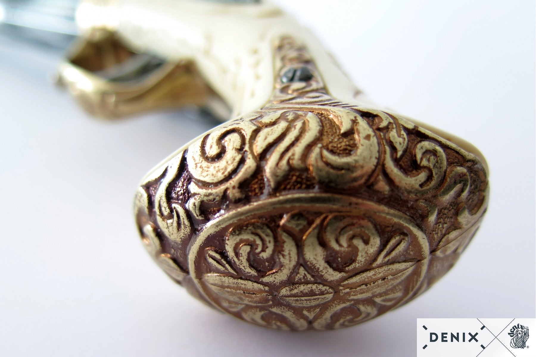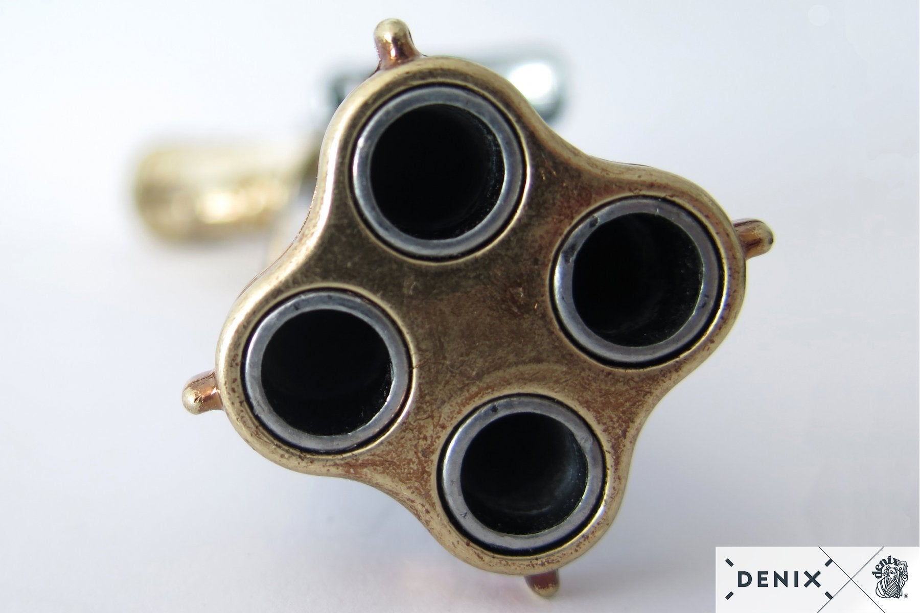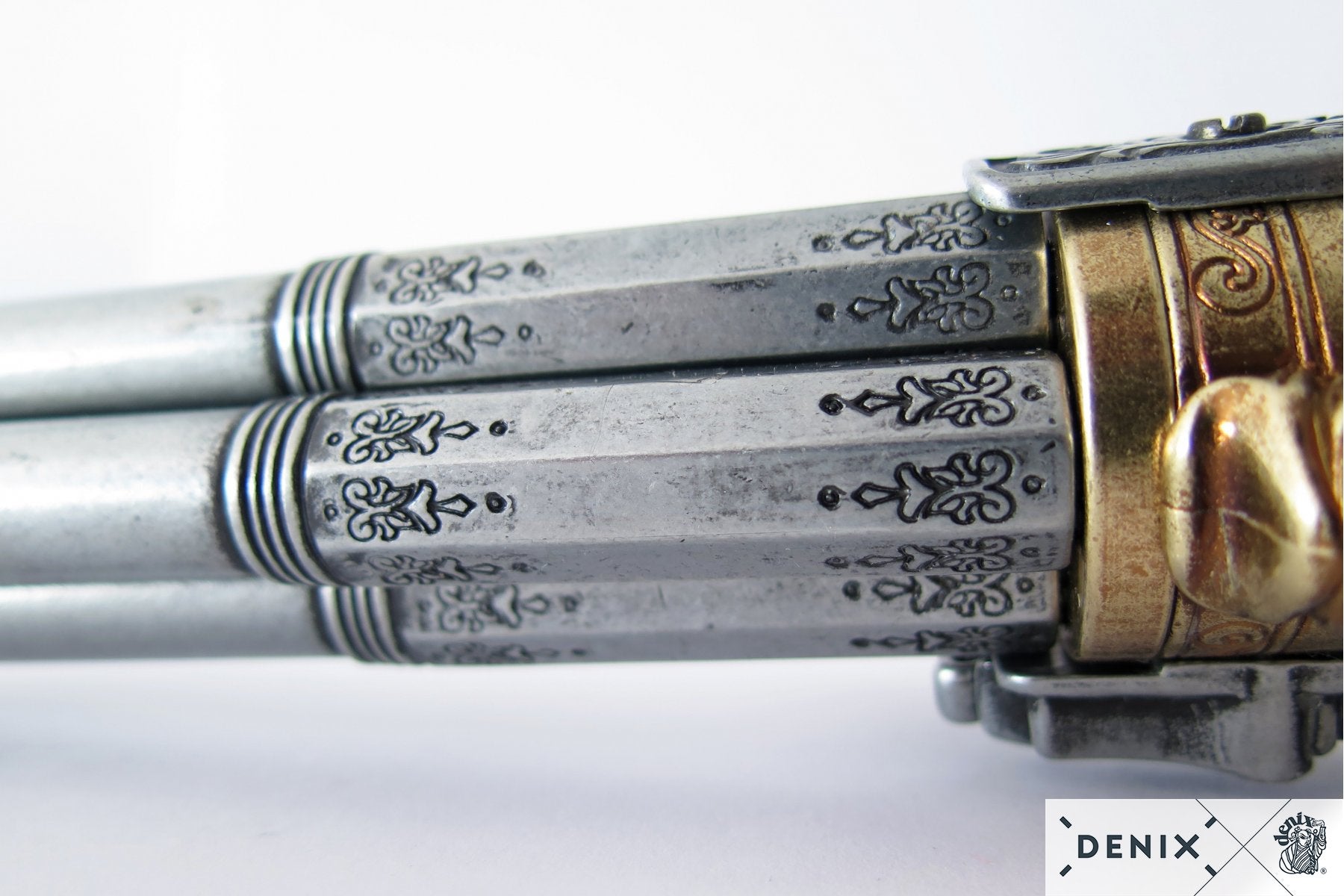 Fransk pistol fra 1800-tallet. 4 løp som roterer. Vekt 1296 gram og lengde 30 cm.