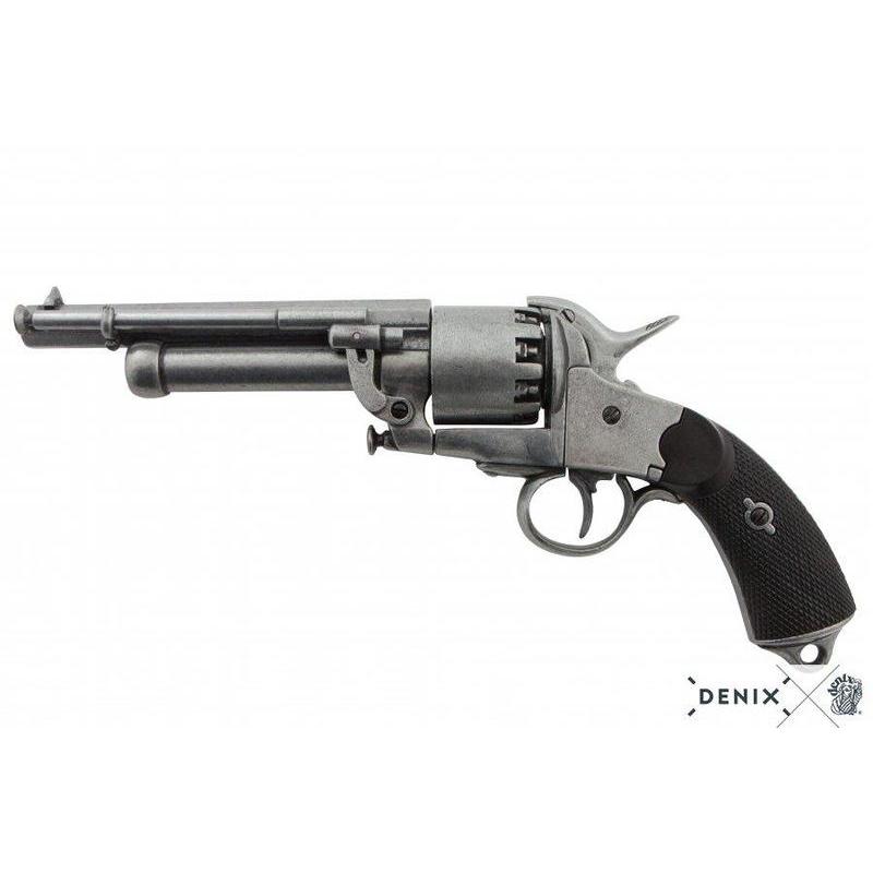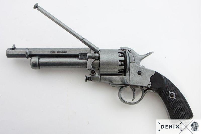 Kopi av Fransk Le Mat Revolver modell 1860. Brukt bl.a. under borgerkrigen i USA. Våpenet veier 1.500 gram og er 37 cm lang.