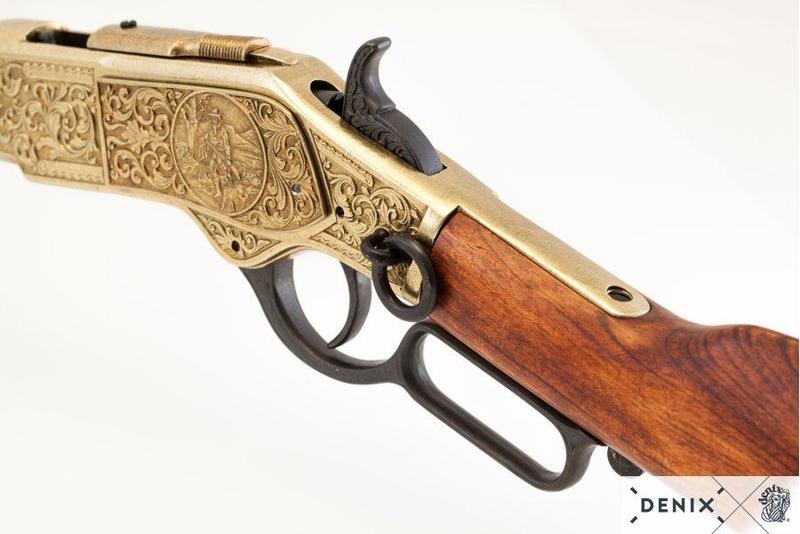 Kopi av Winchester M1873, messingutgave. Låsekassen er gravert.